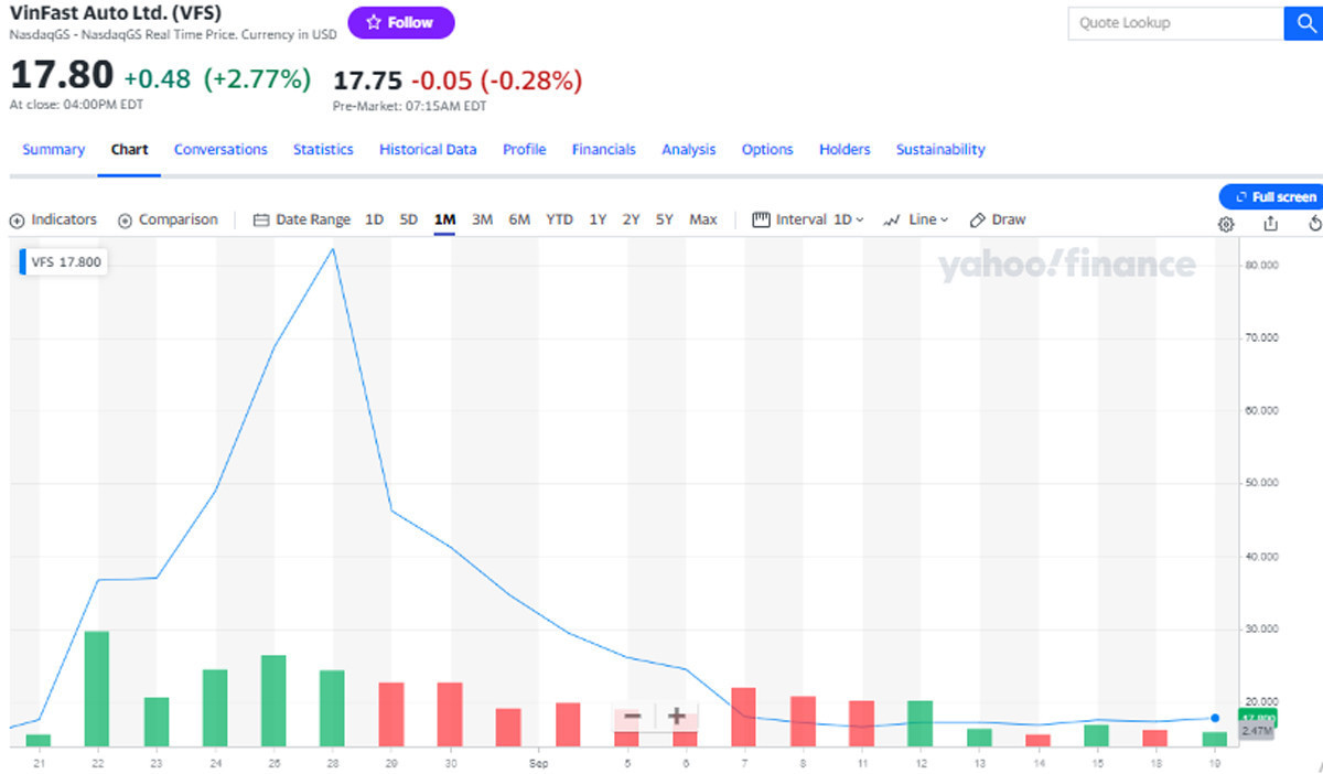Cổ phiếu VinFast duy trì khá vững ở mức 17-18 USD. Vốn hóa hãng xe của tỷ phú Phạm Nhật Vượng đứng trên hãng xe Trung Quốc và được kỳ vọng vững vàng từ những động thái của doanh nhân giàu nhất Việt Nam. (Xem thêm)