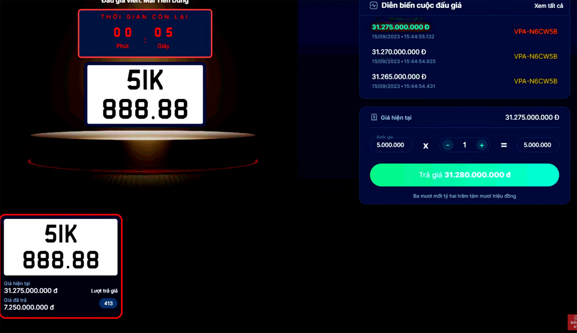 Thời điểm chỉ còn hơn 1 phút cuối, có người trả 31,150 tỷ đồng cho biển số "ngũ quý 8" này. Càng những giây cuối, giá của biển số xe được trả càng nhanh, người cuối cùng trả giá được ghi nhận là 32,340 tỷ đồng.