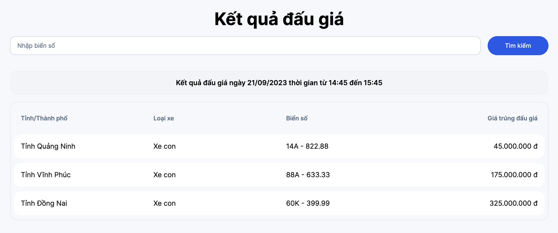 Trước đó, khung giờ từ 14h45 - 15h45, biển số ô tô 14A-822.88 (tỉnh Quảng Ninh) bất ngờ được trả giá thấp nhất với 45 triệu đồng, hai biển số "tứ quý 3", "tứ quý 9" của tỉnh Vĩnh Phúc, Đồng Nai được trả mức giá lần lượt là 175 triệu và 325 triệu đồng.