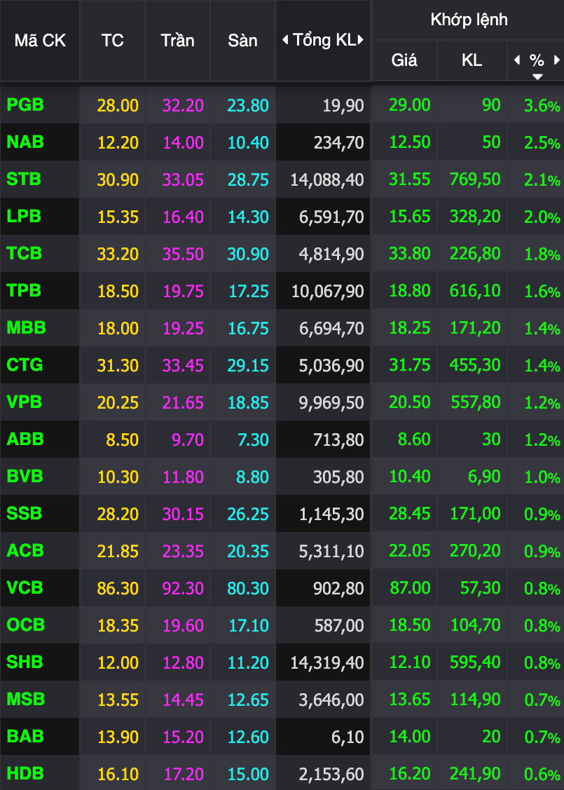Một số mã ghi nhận tăng từ 2% là PGB (+3,6%), NAB (+2,5%), STB (+2,1%), LPB (+2,0%). TCB, TPB, MBB, CTG và VOB cũng ghi nhận tăng trên 1%.
