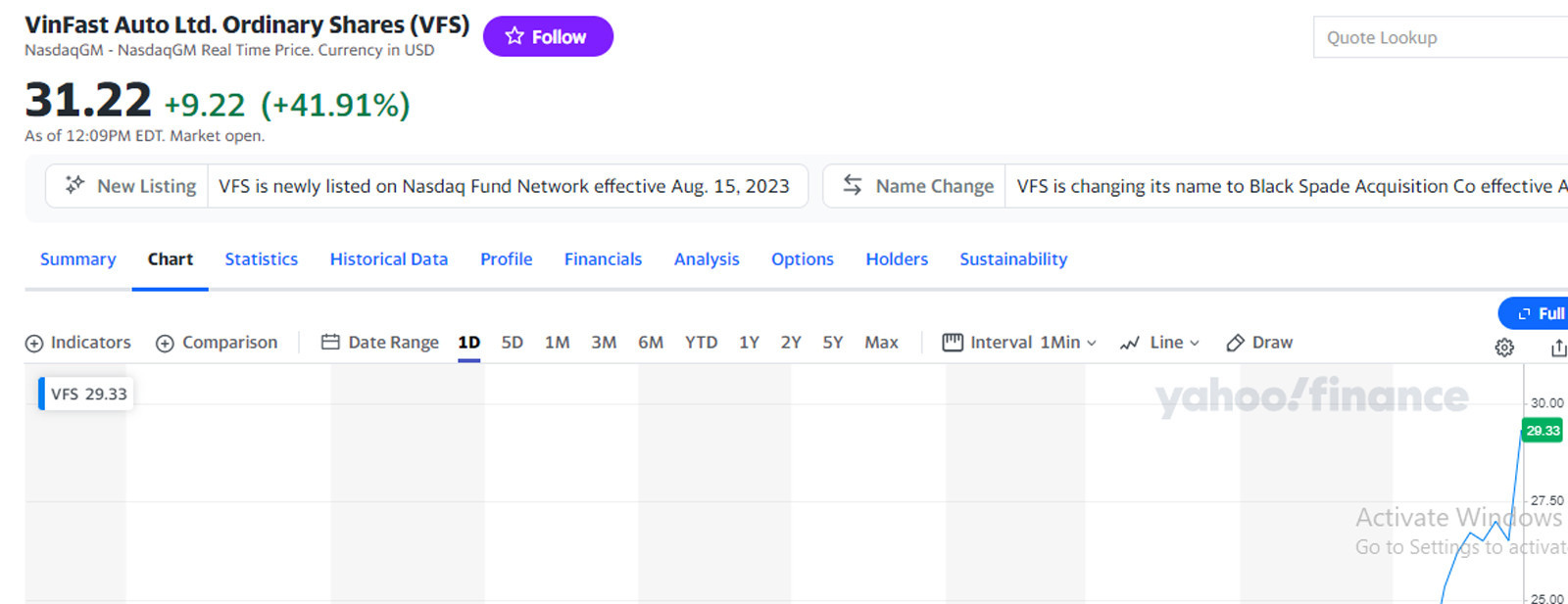 Tính tới 23h 09 ngày 15/8 (giờ Việt Nam), cổ phiếu VFS lên trên ngưỡng 30 USD/cp, vốn hóa tương đương hơn 69 tỷ USD.