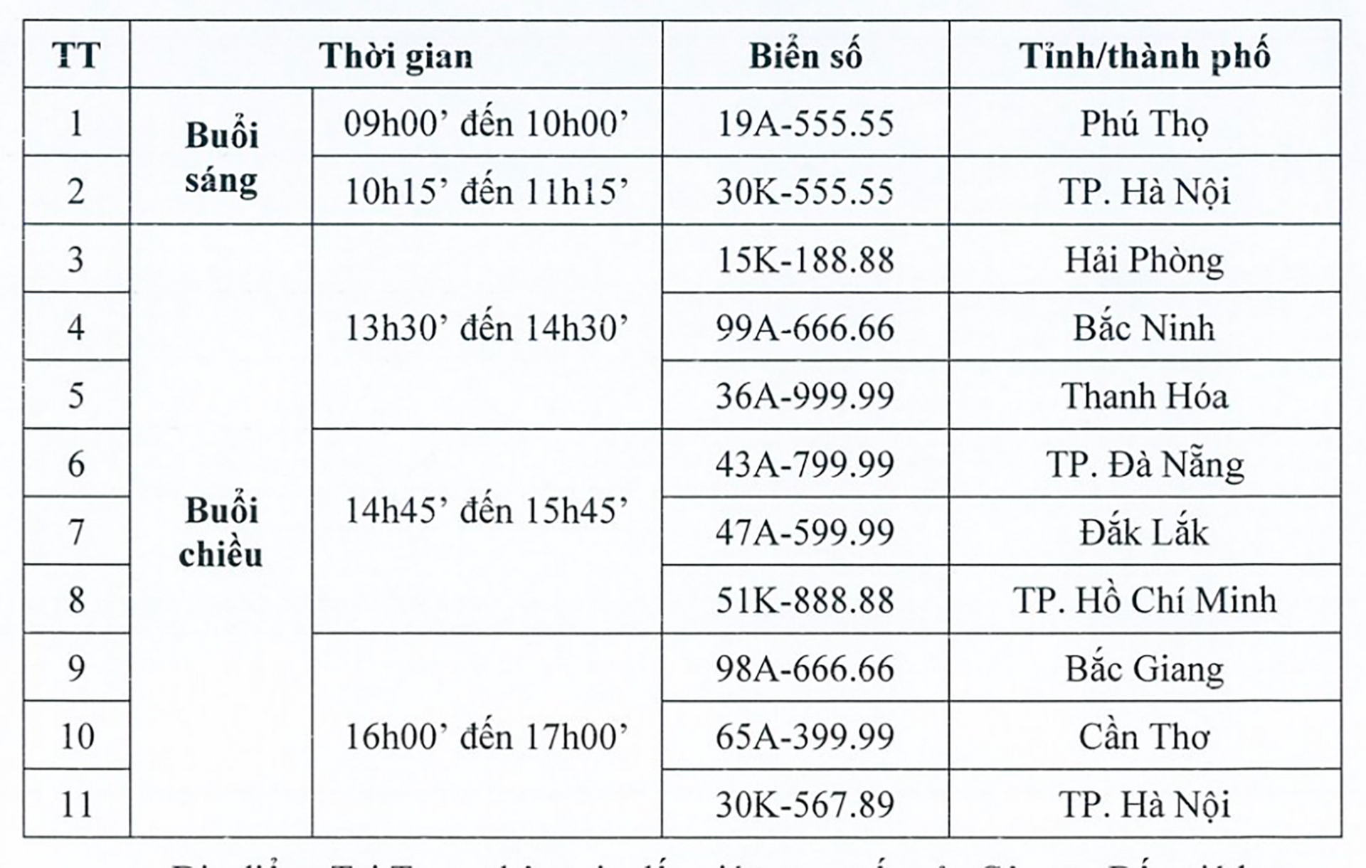 Buổi chiều cùng ngày, sẽ diễn ra 6 cuộc đấu giá gồm: từ 13h30 - 14h30 với các biển 15K-188.88 (TP Hải Phòng), 99A-666.66 (Bắc Ninh), 36A-999.99 (Thanh Hóa); từ 14h45- 14h45 với các biển 43A-799.99 (Đà Nẵng), 47A-599.99 (Đắk Lắk), 51K-888.88 (TP.HCM) và từ 16h- 17h sẽ đấu giá biển số 98A-666.66 (Bắc Giang), 65A- 399.99 (Cần Thơ), 30K-567.89 (TP Hà Nội).