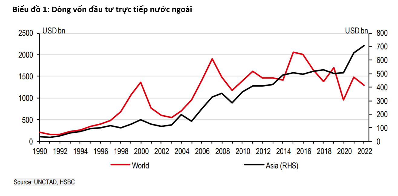 Biểu đồ đầu tiên cho thấy dòng vốn đầu tư trực tiếp từ nước ngoài vào Châu Á và trên toàn thế giới trong thời gian qua. Dòng vốn đầu tư trực tiếp từ nước ngoài vào các nước trên thế giới đã sụt giảm một thời gian sau khi đạt đỉnh vào năm 2015 như một phần của xu hướng "đảo ngược toàn cầu hóa" và "phân mảnh địa kinh tế".