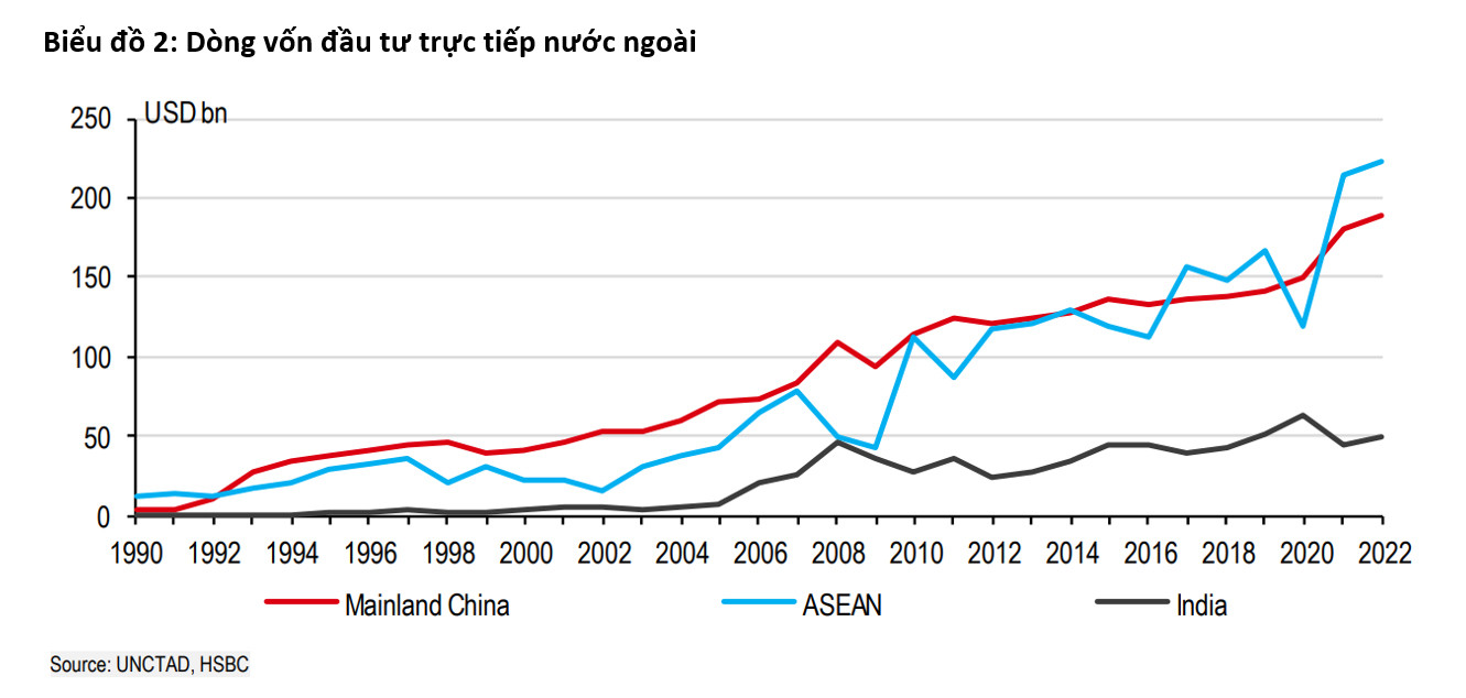 Chúng ta cũng cần phải xem xét kỹ hơn. Là một nơi thu hút FDI, Trung Quốc đại lục thường xuyên nhận được lượng lớn dòng vốn đổ vào (Biểu đồ 2). Năm ngoái, nền kinh tế này đã nhận được lượng đầu tư cao kỷ lục mặc dù nhu cầu sụt giảm và những thách thức đi kèm với chiến lược "Zero COVID". Tuy nhiên, dòng vốn chảy vào ASEAN đã tăng vọt, khu vực này nhận được nhiều vốn hơn Trung Quốc đại lục trong hai năm liên tiếp. Đồng thời, dòng vốn chảy vào Ấn Độ cũng đang có xu hướng tăng lên, nhưng xét về tổng thể thì vẫn còn thấp hơn nhiều.