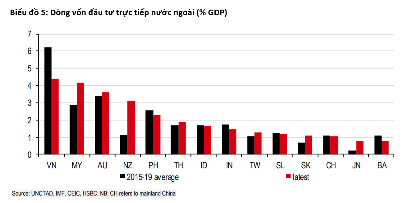 Biểu đồ 5 cho thấy tương quan tầm quan trọng của FDI trên toàn khu vực. Tại Việt Nam, Malaysia, New Zealand, Úc và Philippines, dòng vốn FDI chiếm hơn 2% GDP. Ngược lại, ở Hàn Quốc, Nhật Bản, Trung Quốc đại lục và Bangladesh, dòng vốn FDI chiếm khoảng 1% GDP hoặc ít hơn.