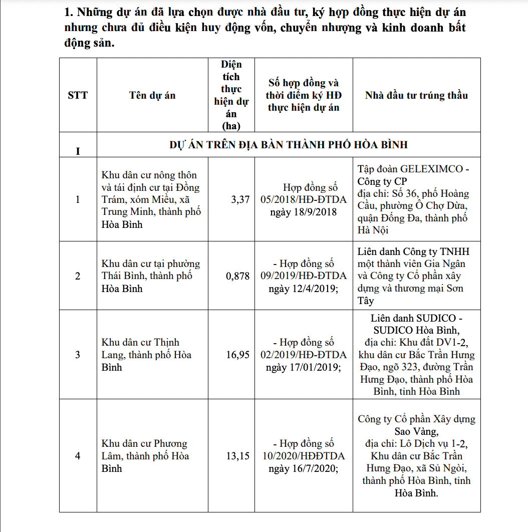 Dự án Khu đô thị mới Sông Đà - Hòa Bình tại phường Thái Bình và xã Dân Chủ, thành phố Hòa Bình của Công ty Cổ phần Đầu tư xây dựng và phát triển đô thị Sông Đà; Khu đô thị mới Trung Minh B, xã Trung Minh, thành phố Hòa Bình, tỉnh Hòa Bình do Liên danh Công ty Cổ phần Lã Vọng Group và Công ty Cổ phần Thương mại Ngôi Nhà mới làm chủ đầu tư.