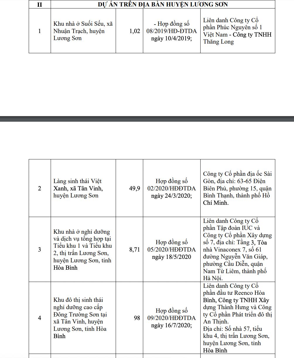 Tại huyện Lương Sơn, Sở Xây dựng Hòa Bình cũng điểm danh 5 dự án là Làng sinh thái Việt Xanh, của Công ty Cổ phần địa ốc Sài Gòn; Khu nhà ở nghỉ dưỡng và dịch vụ tổng hợp tại Tiểu khu 1 và Tiểu khu 2, thị trấn Lương Sơn do Liên danh Công ty Cổ phần Tập đoàn IUC và Công ty Cổ phần Xây dựng số 7 làm chủ đầu tư; Khu đô thị sinh thái nghỉ dưỡng cao cấp Đông Trường Sơn tại xã Tân Vinh do Liên danh Công ty Cổ phần đầu tư Reenco Hòa Bình, Công ty TNHH Xây dựng Thành Hưng và Công ty Cổ phần Phát triển đô thị An Thịnh làm chủ đầu tư…