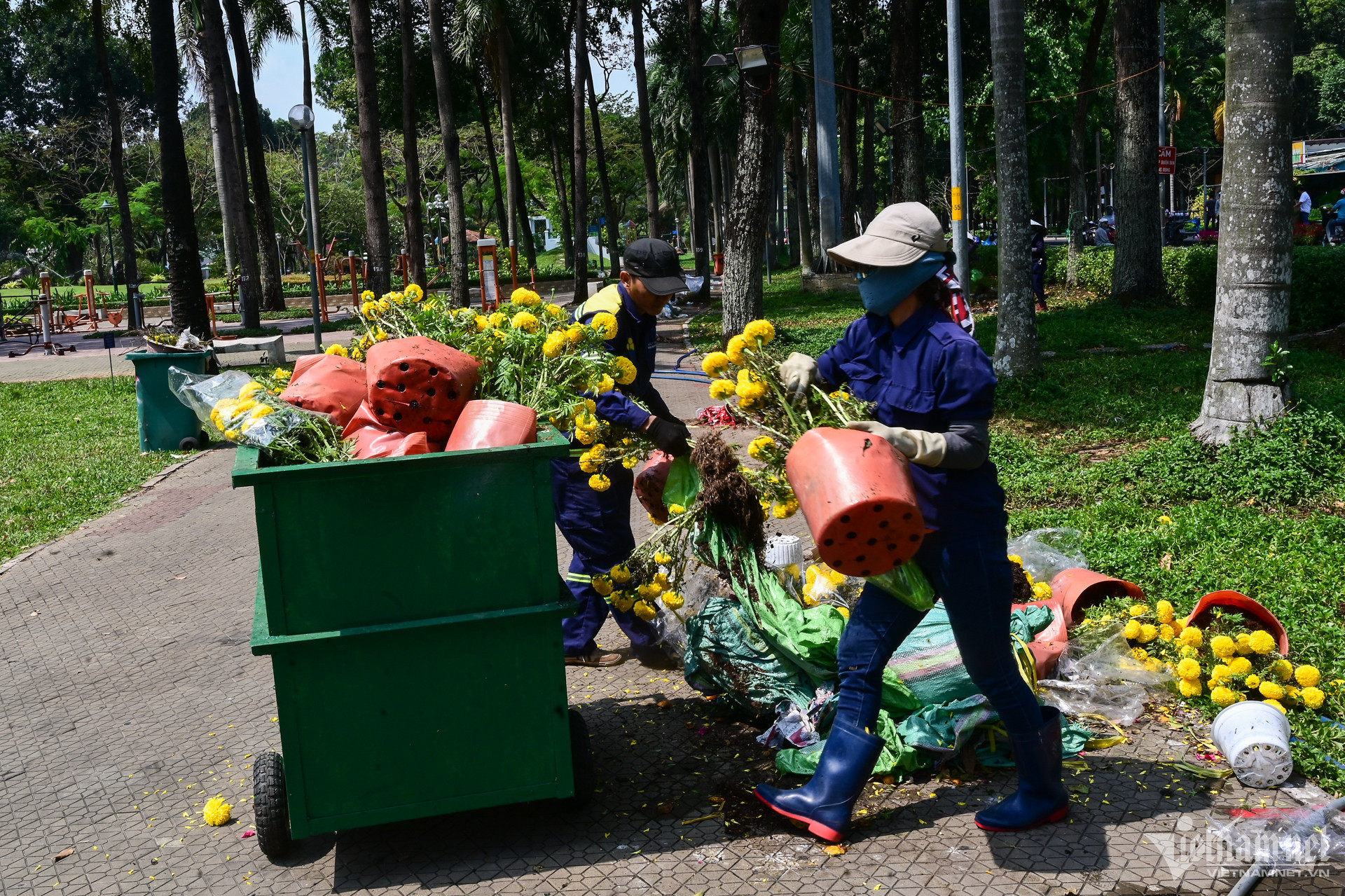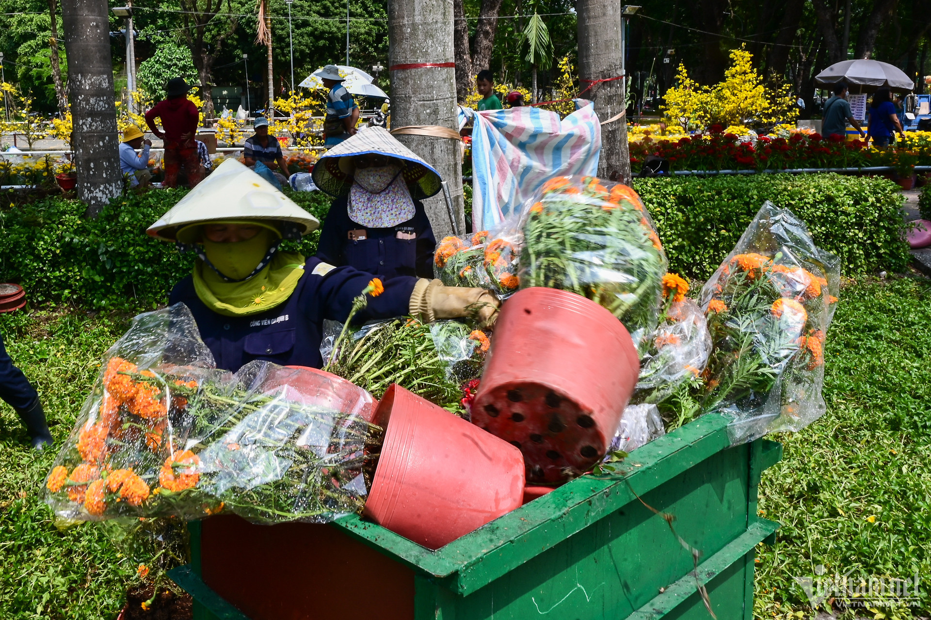 12h, chợ hoa Công viên Gia Định (quận Gò Vấp) cũng đóng cửa để dọn dẹp vệ sinh. Rất nhiều chậu hoa hỏng, xấu, thối rễ... bị bỏ lại. Trong đó hoa cúc, vạn thọ... bị vứt đi nhiều nhất được các công nhân vệ sinh thu gom vào xe rác.