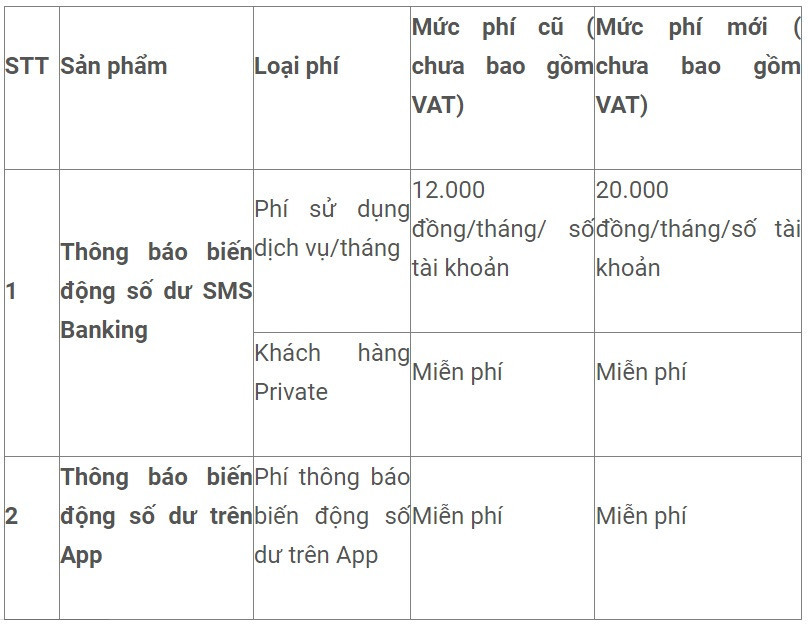 Mức phí cũ trước đây là 12.000 đồng/tháng/tài khoản (chưa bao gồm VAT). Mức phí mới tăng thêm 8.000 đồng lên mức 20.000 đồng/tháng/tài khoản. Tính cả VAT, khách hàng cá nhân phải trả phí SMS Banking lên đến 22.000 đồng/tháng bao gồm cả VAT.