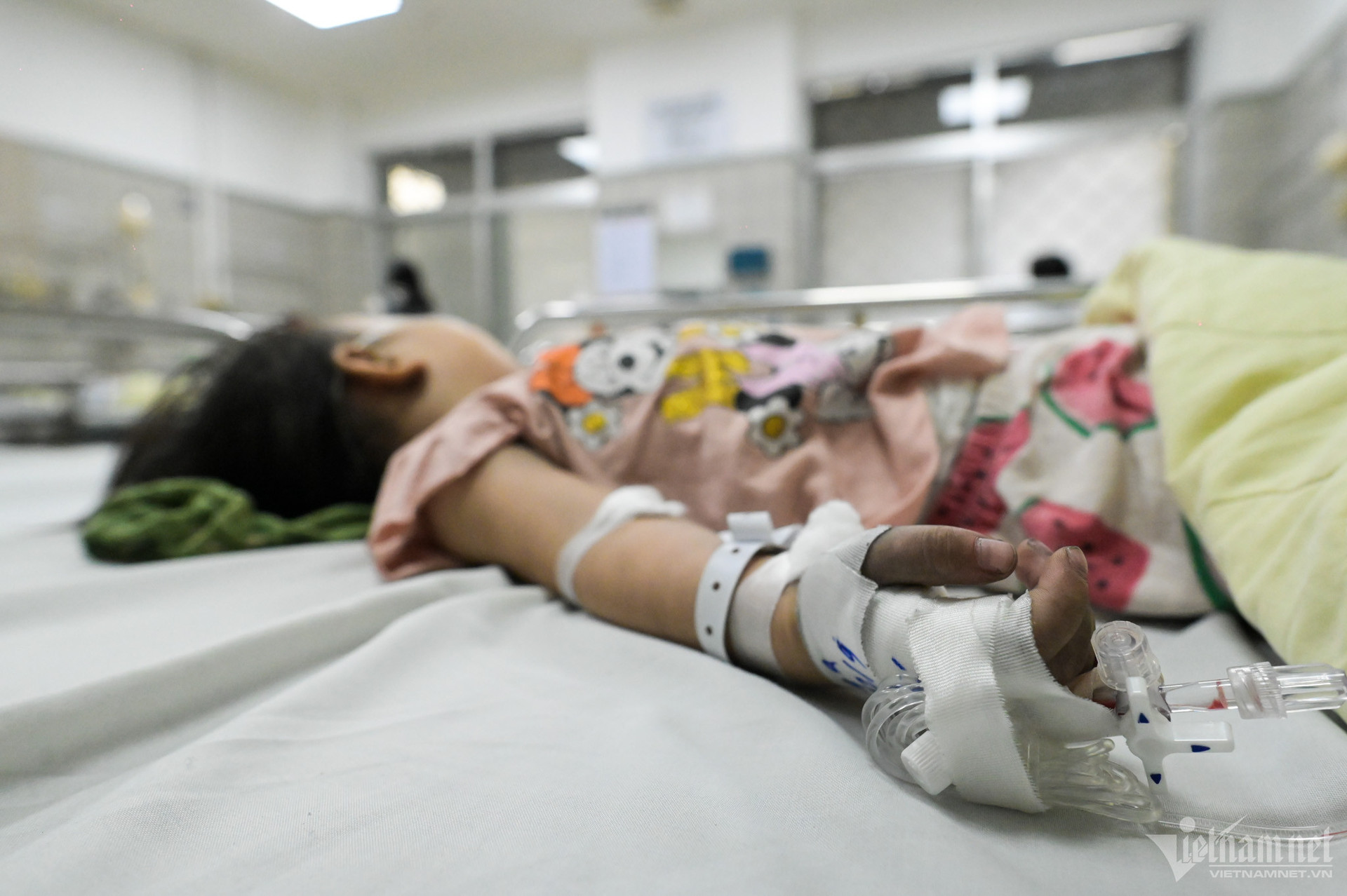Thủ tướng đến thăm Trung tâm Nhi khoa, nơi đang điều trị cho 7 nạn nhân nhỏ tuổi. Trong ảnh là hai bệnh nhi cùng một gia đình đang được người bà chăm sóc. Theo chia sẻ của người thân, gia đình các em có 5 thành viên gồm bố mẹ và 3 người con. Hiện bố và mẹ đang nằm tại khoa hồi sức sau phẫu thuật vì chấn thương sau khi nhảy khỏi tầng 3 của tòa nhà. Khi đó, người bố ôm theo cô con gái út (2 tuổi) nhảy xuống. Con trai và con gái chạy theo người dân trong ngôi nhà lên tầng 7 nhưng bị thất lạc nhau. Sau đó, cậu bé sau đó được giải cứu. Người chị gái hiện chưa rõ tung tích.
