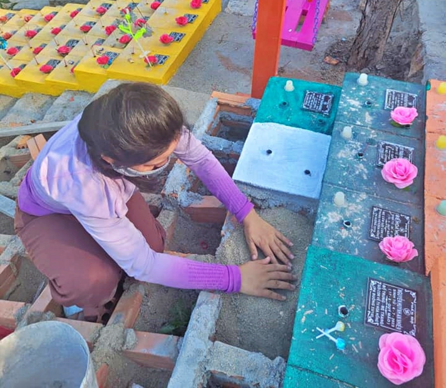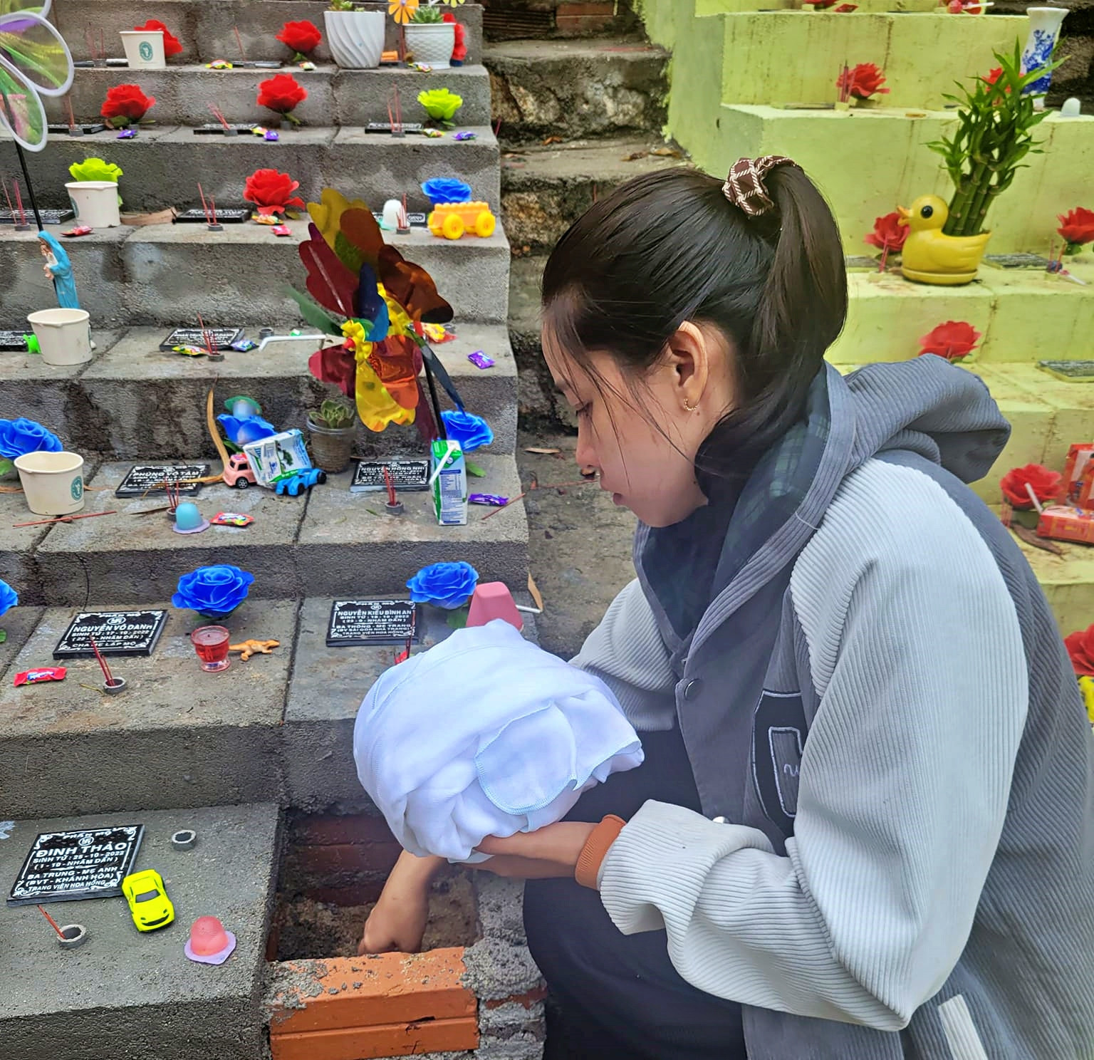 Tại đây, chị tắm rửa, tẩm liệm cho các bé trước khi thực hiện việc chôn cất. Đối với các bé được cha mẹ thừa nhận hoặc mất sau khi sinh, chị vận động cha mẹ các bé xây mộ phần cho con mình.