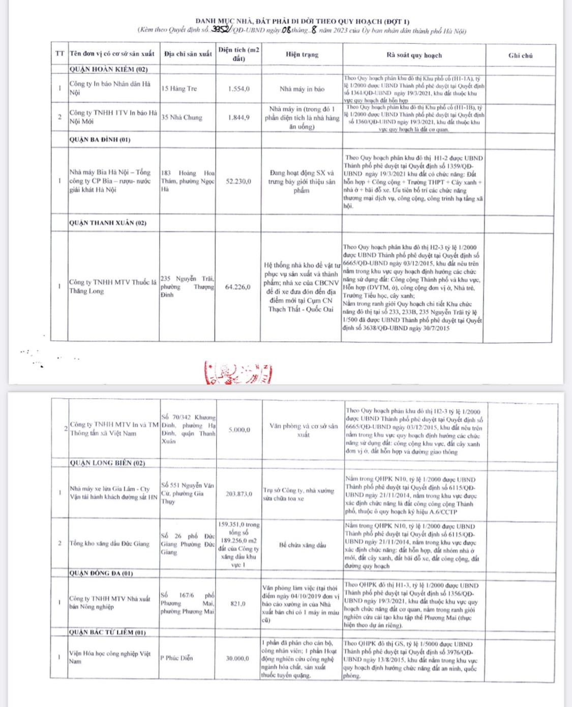 Nhà máy Bia Hà Nội (HABECO), Công ty Thuốc lá Thăng Long cùng 7 cơ sở nhà, đất do các doanh nghiệp đang quản lý, sử dụng không phù hợp quy hoạch phải di dời khỏi nội đô trong 5 năm tới.