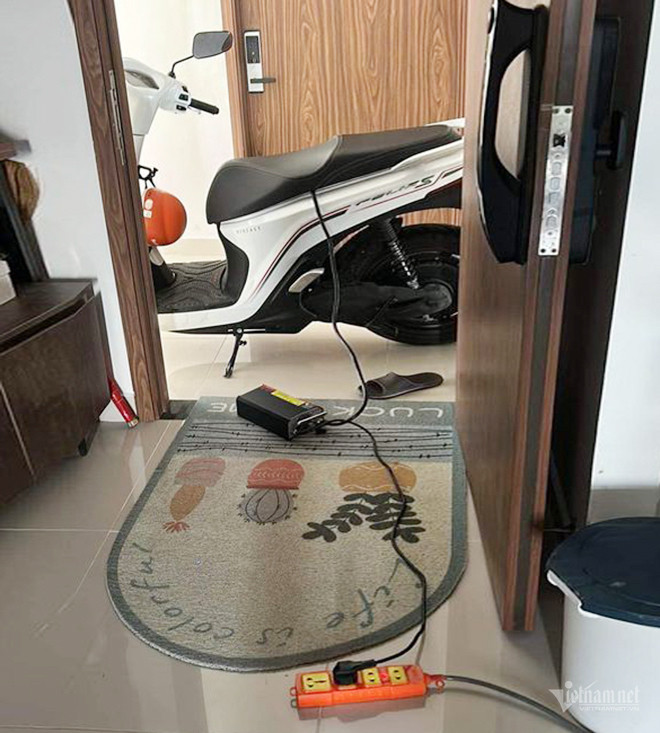Chia sẻ với VietNamNet, anh Khánh cho biết, cách đây 2 hôm, Ban quản lý toà nhà nơi anh sinh sống bất ngờ thông báo cư dân không được sạc xe máy điện ở tầng hầm. Cực chẳng đã, anh đã phải đưa hẳn xe lên thang máy và dựng ngay trước cửa nhà để sạc pin hàng ngày.