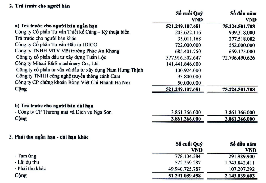 Lượng tiền mặt và tương đương giảm từ 634 tỷ về còn 94 tỷ. Ngược lại, các khoản trả trước cho người bán, phải thu ngắn hạn khác bất ngờ tăng vọt so với đầu năm.