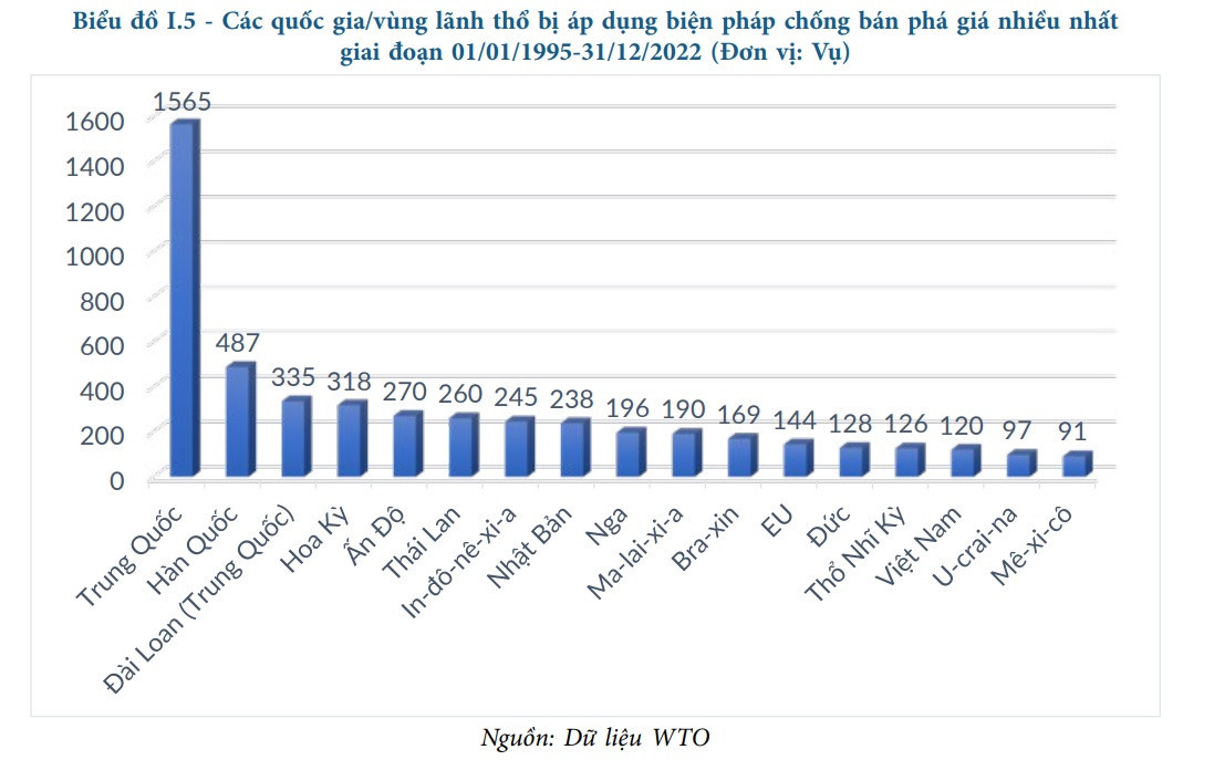 Giai đoạn từ 1/1/1995 đến 31/12/2022, Trung Quốc là quốc gia bị khởi xướng điều tra biện pháp chống bán phá giá nhiều nhất với 1.565 vụ việc, chiếm 24% tổng số vụ việc (6.582 vụ việc) của các thành viên WTO bị khởi xướng.