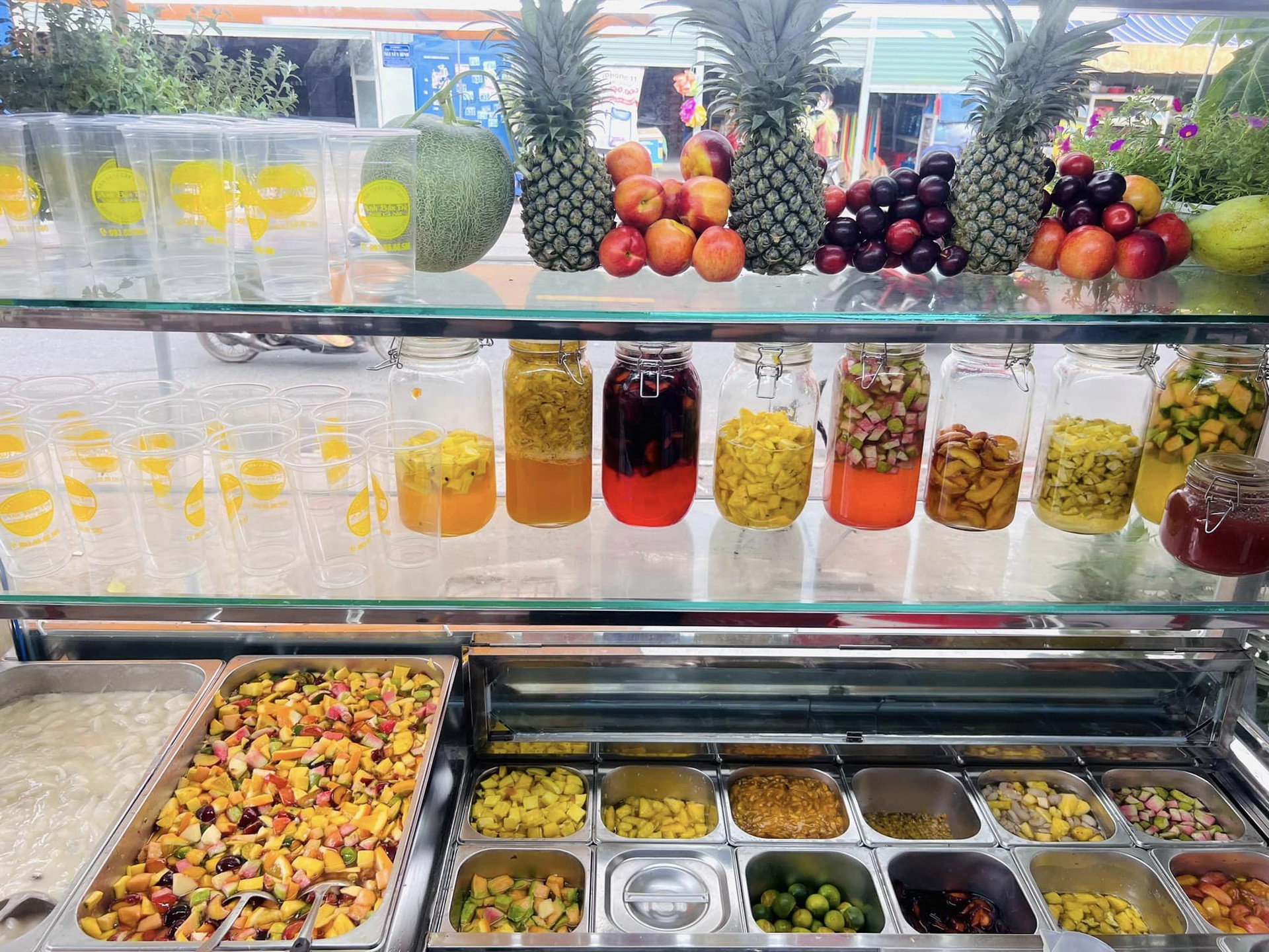 Quán mở từ 10h sáng tới 22h đêm. Để chuẩn bị đủ lượng trái cây tươi, anh Tùng thường đi chợ đầu mối tại TP. Thủ Đức trước 1h sáng. Tuỳ theo mùa mà các loại trái cây sẽ khác nhau, nhưng không dưới 10 loại.