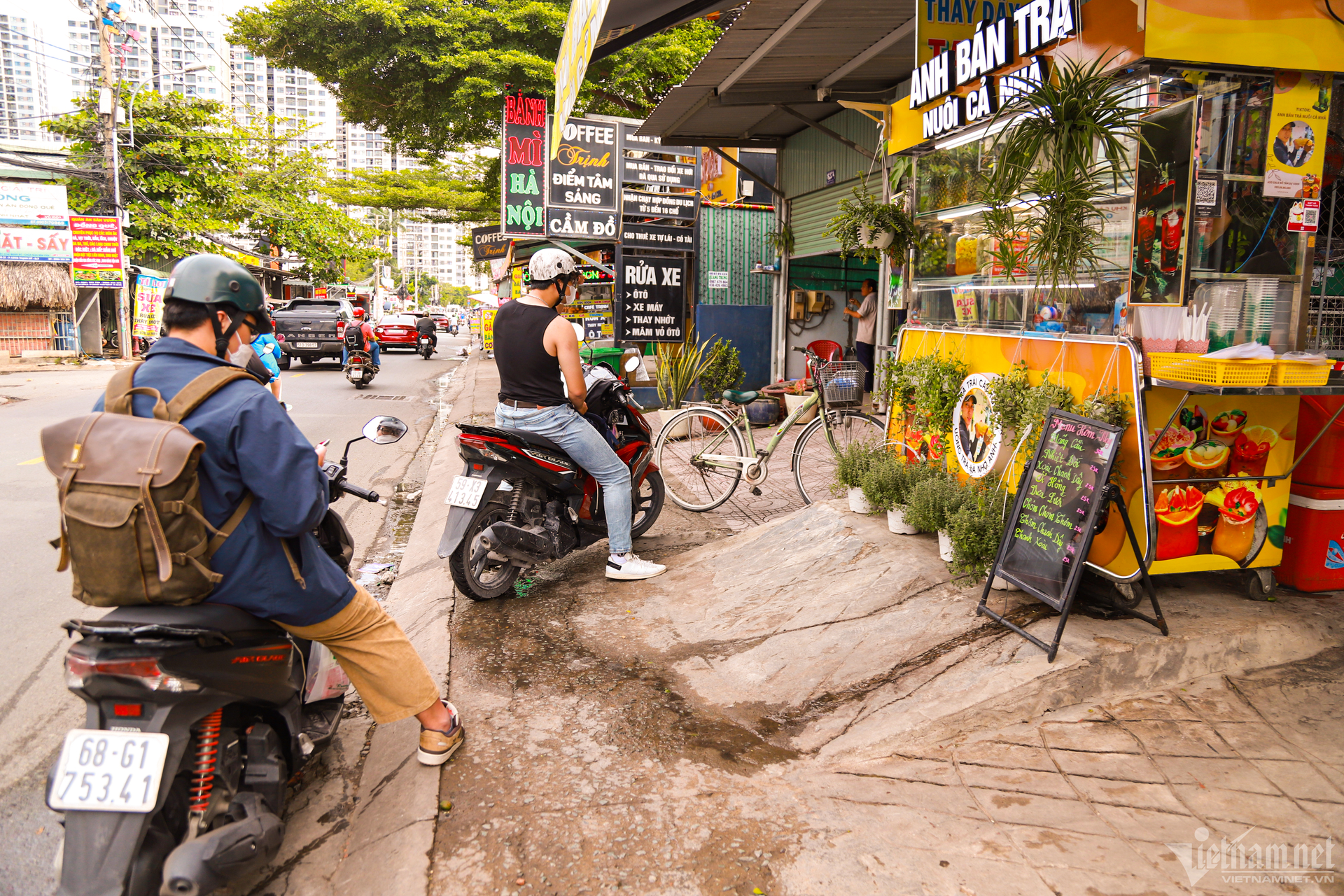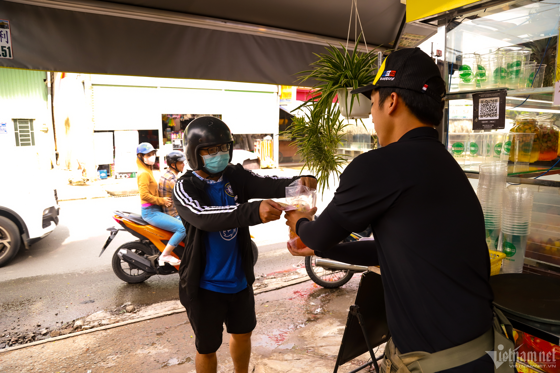 "Mình bán xe trà này từ tháng 3 năm nay. Lúc đó, vợ vừa sinh em bé, mình lại vừa nghỉ việc, áp lực tài chính rất lớn. Mình xách xe chạy một vòng giữa lúc trời nắng đổ lửa. Tự nhiên, mình nảy ra ý tưởng, thử bán thức uống giải nhiệt", anh Tùng nhớ lại.
