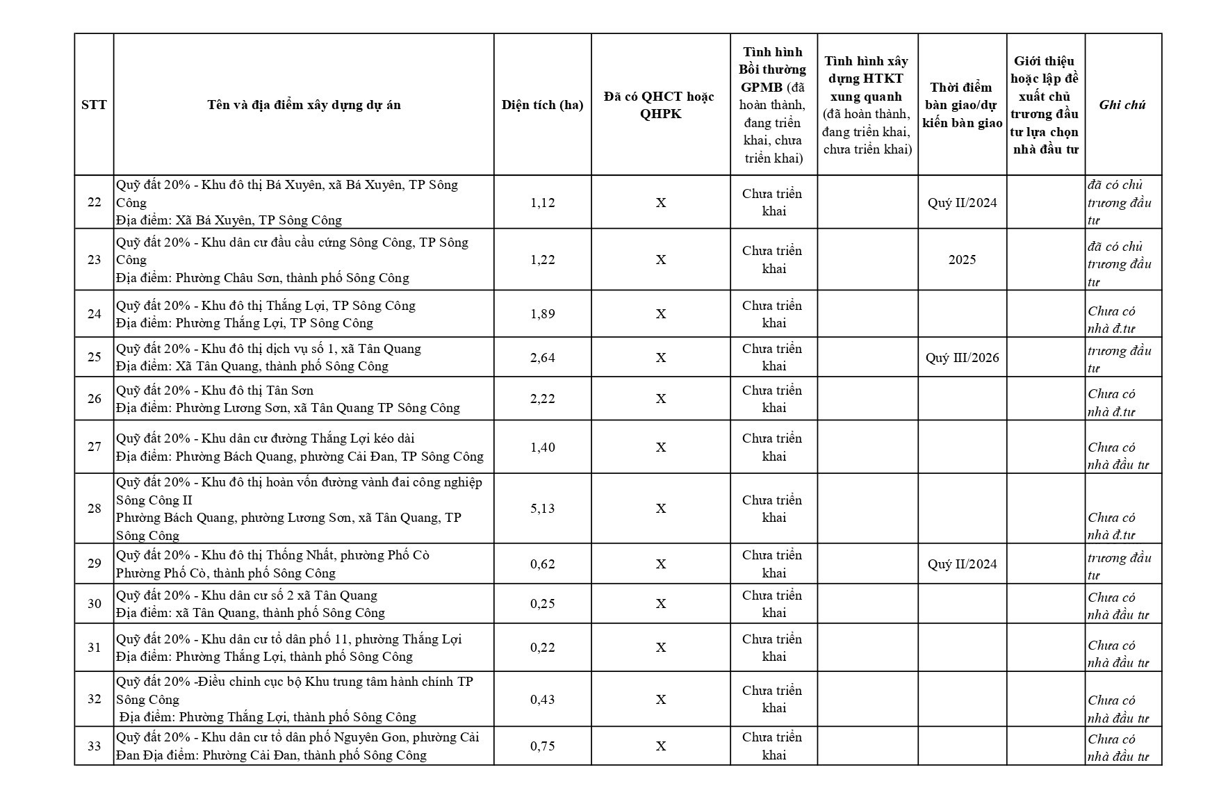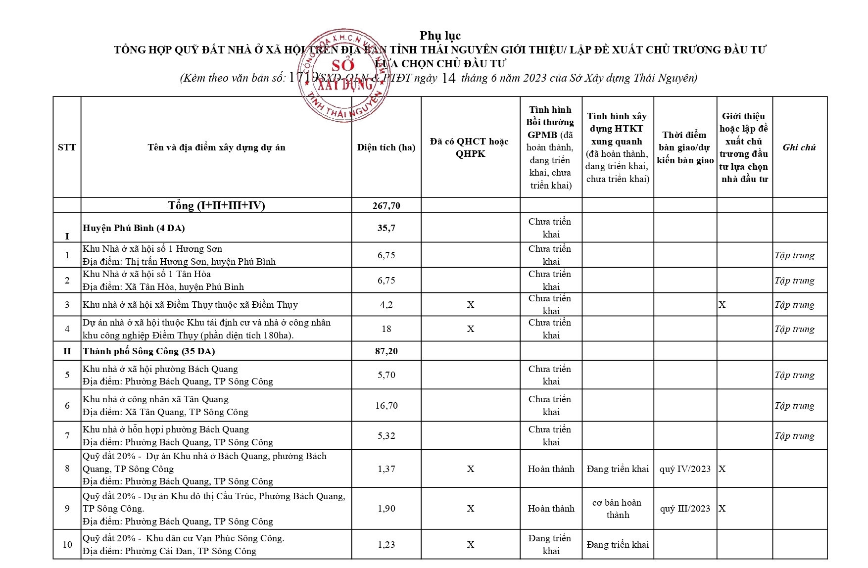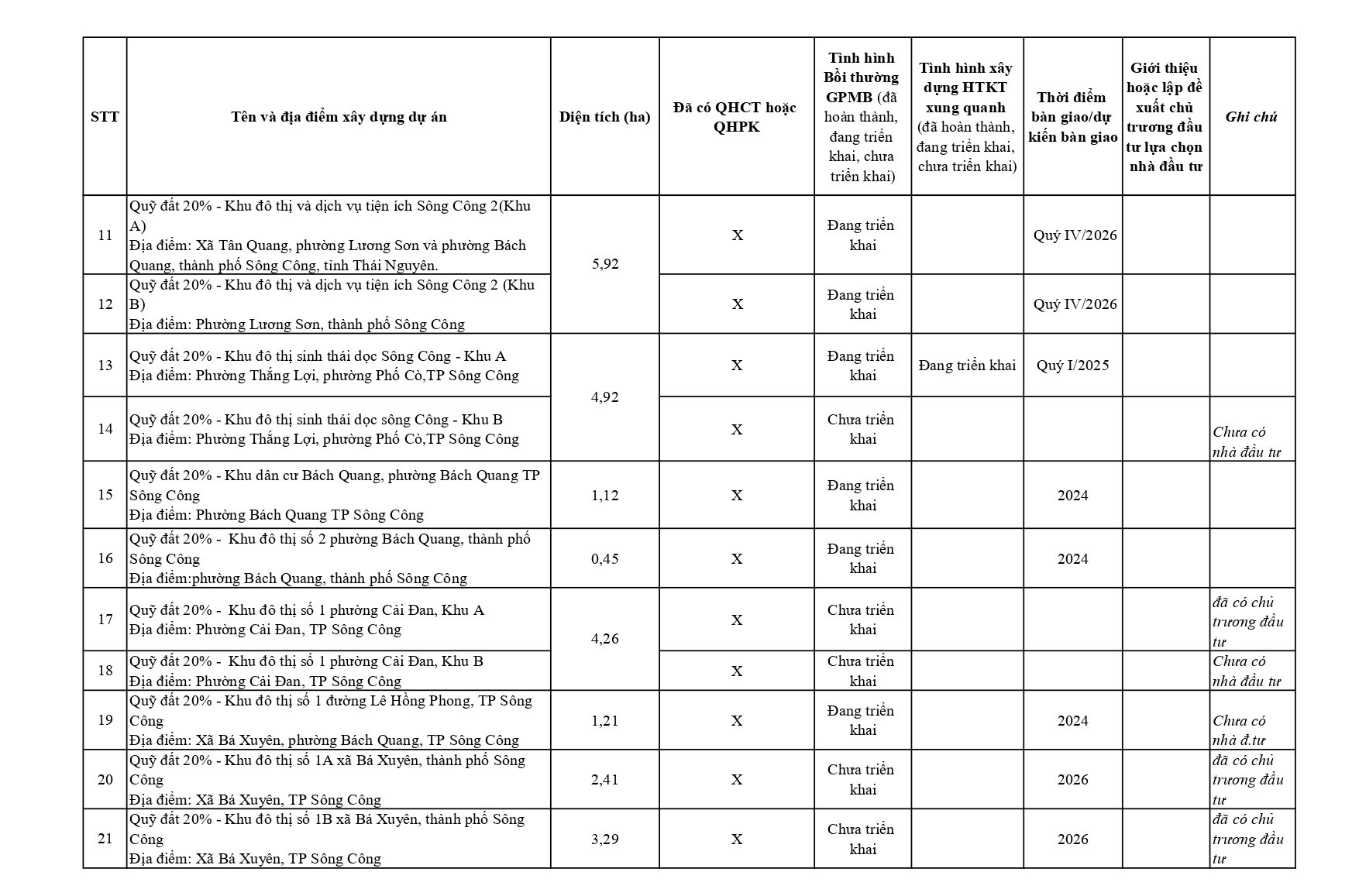 UBND tỉnh Thái Nguyên vừa công bố 82 dự án, vị trí quỹ đất để thực hiện thu hút đầu tư phát triển nhà ở xã hội trên địa bàn tỉnh. Trong đó, thành phố Sông Công nhiều nhất với 35 dự án.