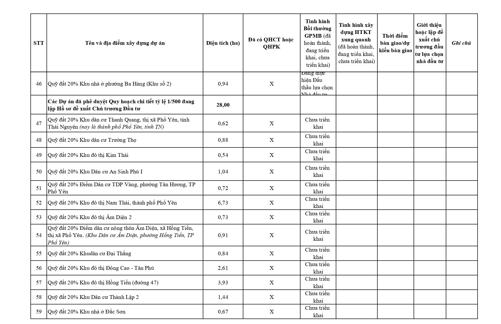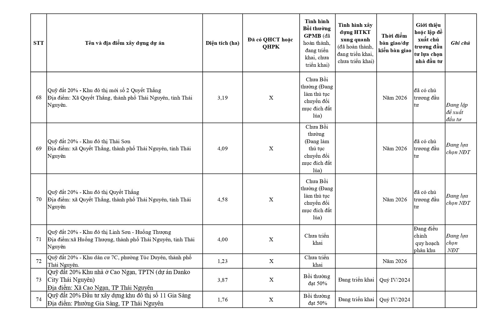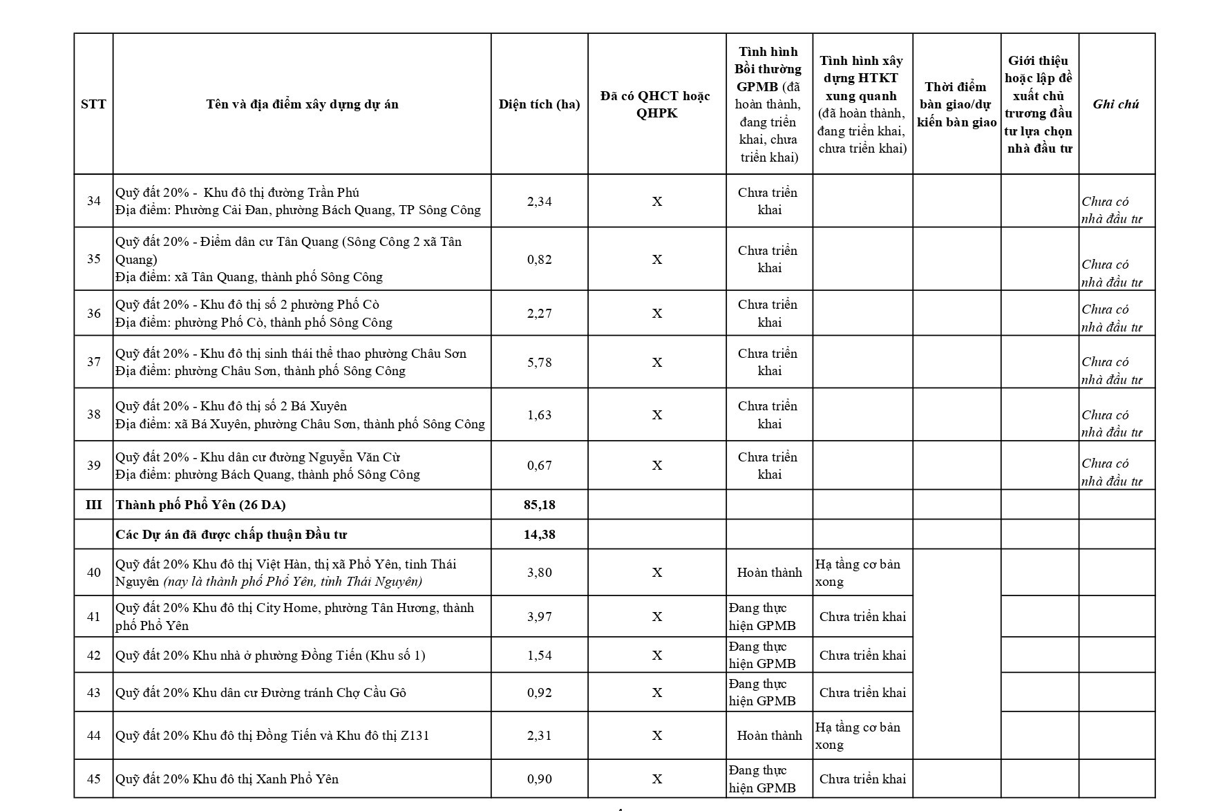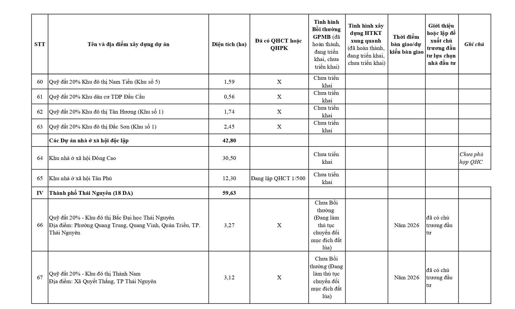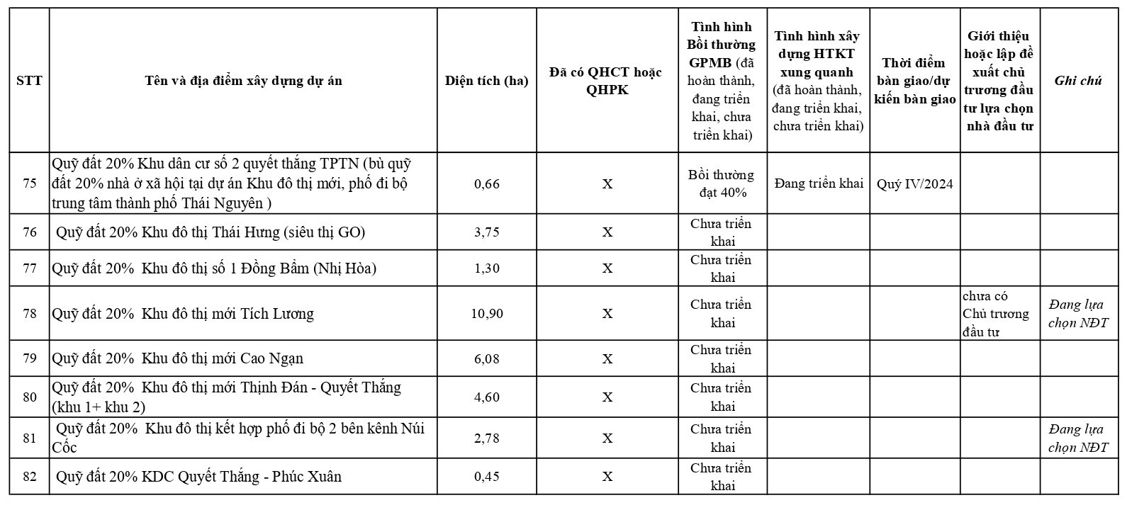 Cụ thể danh mục 82 dự án, vị trí quỹ đất để thực hiện thu hút đầu tư phát triển nhà ở xã hội trên địa bàn tỉnh Thái Nguyên: