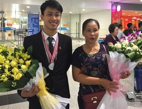 Nguyễn Thế Quỳnh về nước sau khi giành HCV tại Olympic quốc tế năm 2017. Ảnh: Báo Lao Động, Báo Dân Trí