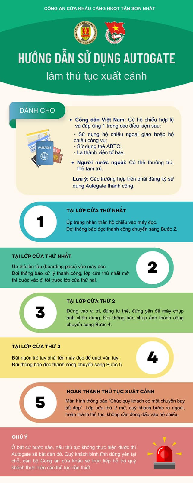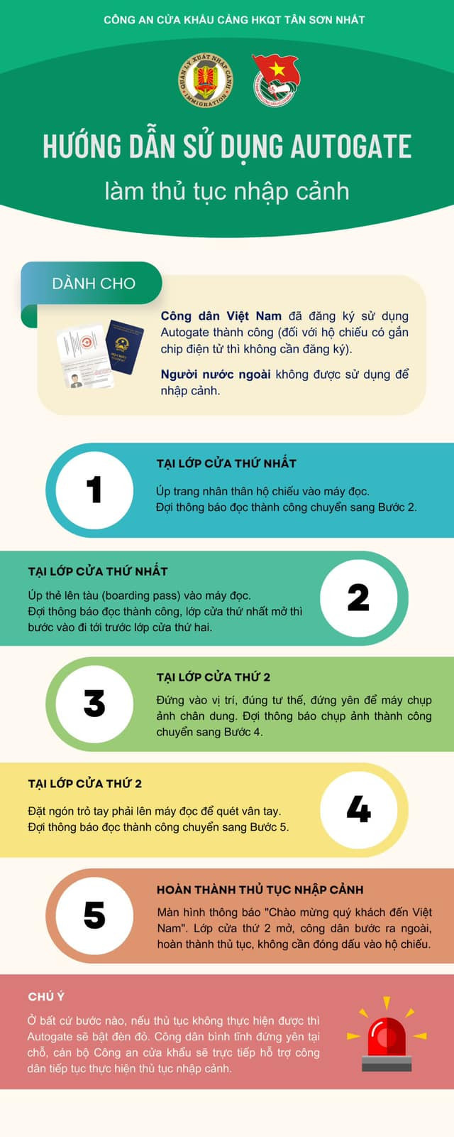 Lưu ý, tại bất cứ bước nào, nếu thủ tục không thực hiện được thì Autogate sẽ bật đèn đỏ. Hành khách bình tĩnh đứng yên tại chỗ, cán bộ Công an cửa khẩu sẽ trực tiếp hỗ trợ hành khách tiếp tục thực hiện thủ tục cần thiết.